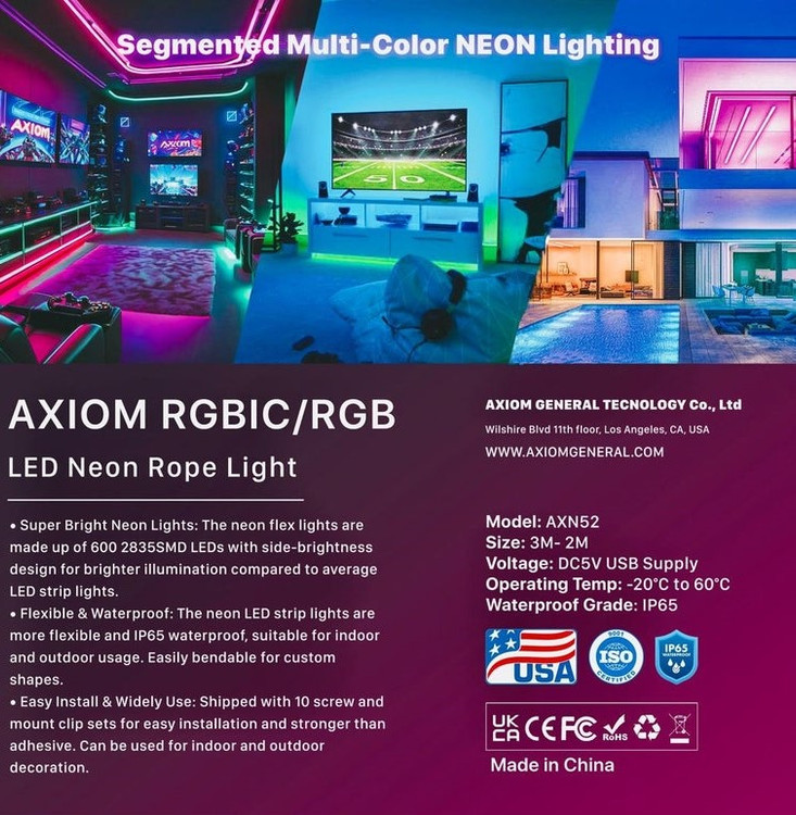 کنترل بیدردسر با ریموت کنترل همراه، امکان تغییر رنگ، دما و شدت نور را برایتان فراهم میکند. این محصول با استاندارد ضد آب IP65 (مناسب برای فضاهای داخلی و نیمهخارجی) طراحی شده است. نور صاف و یکنواختِ نئون — بدون نقطههای تیز LED — تجربهای لطیف و زیبا برای محیط شما میسازد. اگر میخواهید با هزینهای مناسب، طراحی نورپردازی دلچسبی برای خانه یا محل کارتان داشته باشید، Axiom Neon RGB 3M انتخاب خوبی است.
