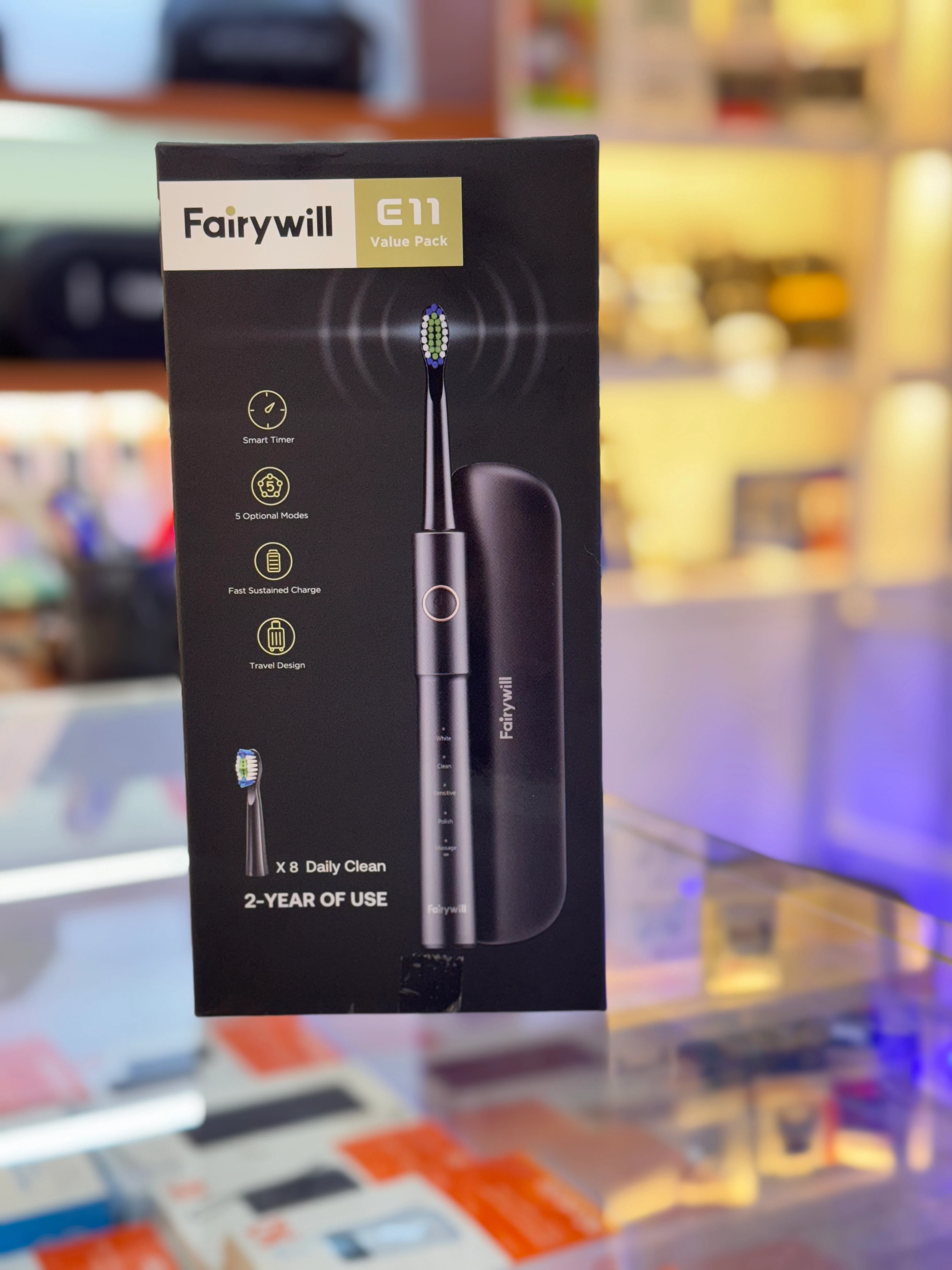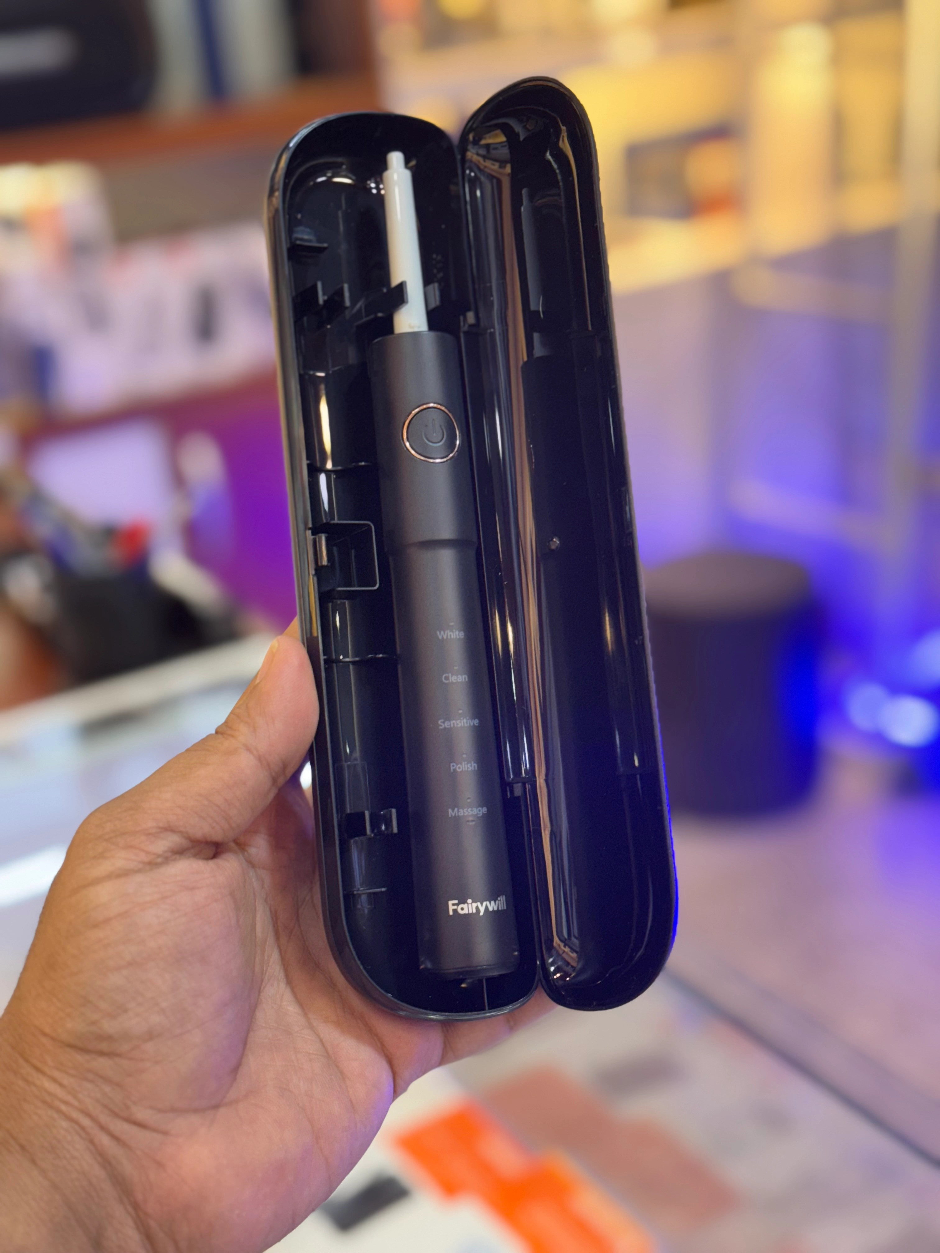 مسواک برقی فایری ویل موجود در رنگ مشکی میباشد. ارتعاش صوتی تا 4000 ضربه در دقیقه با بازدهی بیش از 100 درصد نسبت به مسواک برقی دارد. دارای تایمر هوشمند دو دقیقه ای برای مدیریت زمان و مسواک زدن طبق توصیه ی دندان پزشکان میباشد. دارای بالاترین درجه استاندارد ضد آب ipx7 برای آسودگی خاطر در شست و شو میباشد. برس w شکل با قابلیت تغییر رنگ برای تشخیص زمان تعویض را دارا میباشد. دارای شارژ 2 ساعته USB و استفاده بیشتر از 30 روز است. دارای 8 سر مسواک اضافی میباشد. دارای 5 مد مختلف : White, Clean, Sensitive, Polish, Massage میباشد.